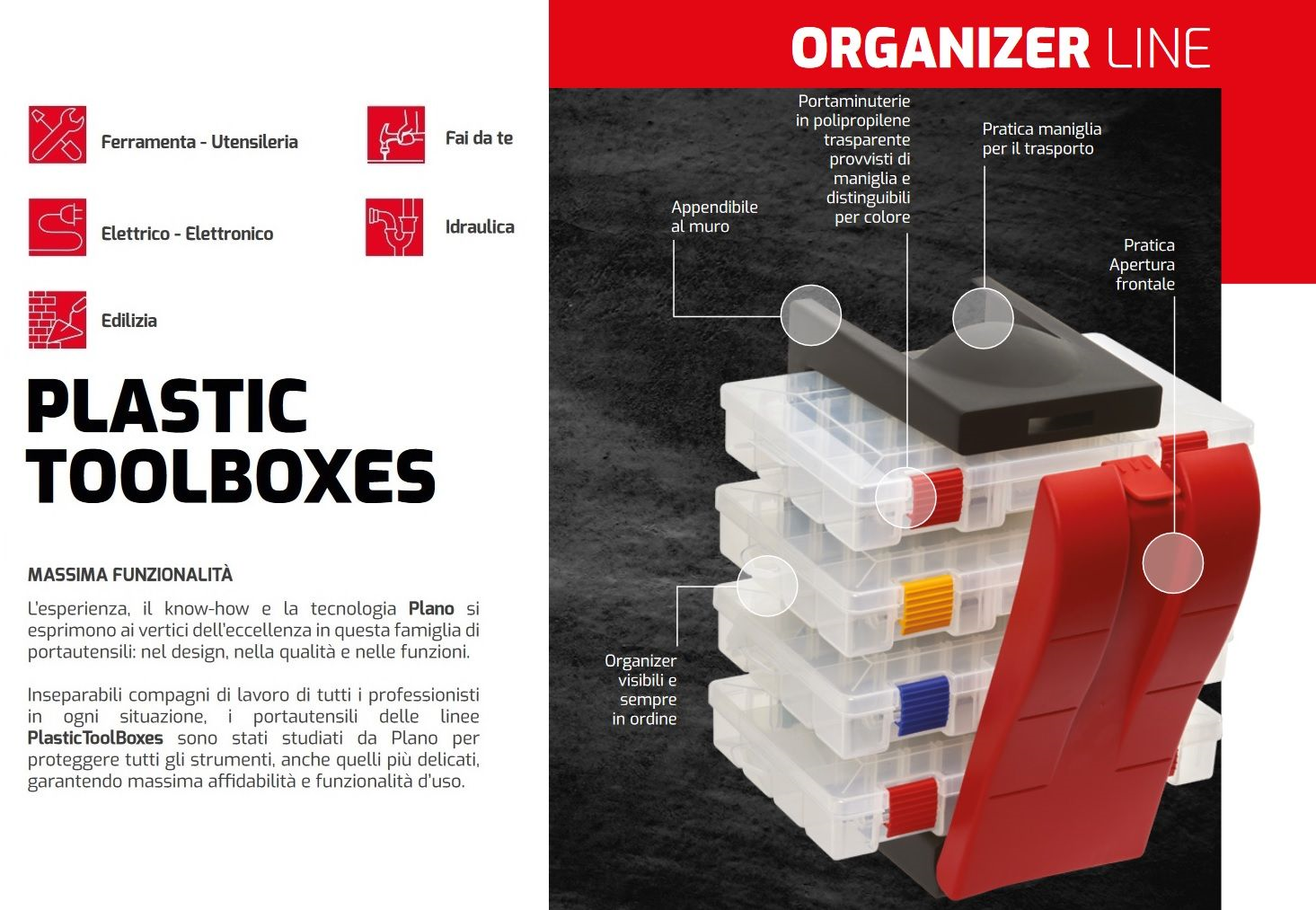 Raccoglitore Planbox della Plano "Organizer Line", ideale come contenitore professionale per articoli di ferramenta, utensileria, elettrici, elettronici e per fai da te. Raccoglitore PLANO Organizer 3450 realizzato in polipropilene trasparente, utile per tenere in ordine utensili e dispositivi di piccole dimensioni.