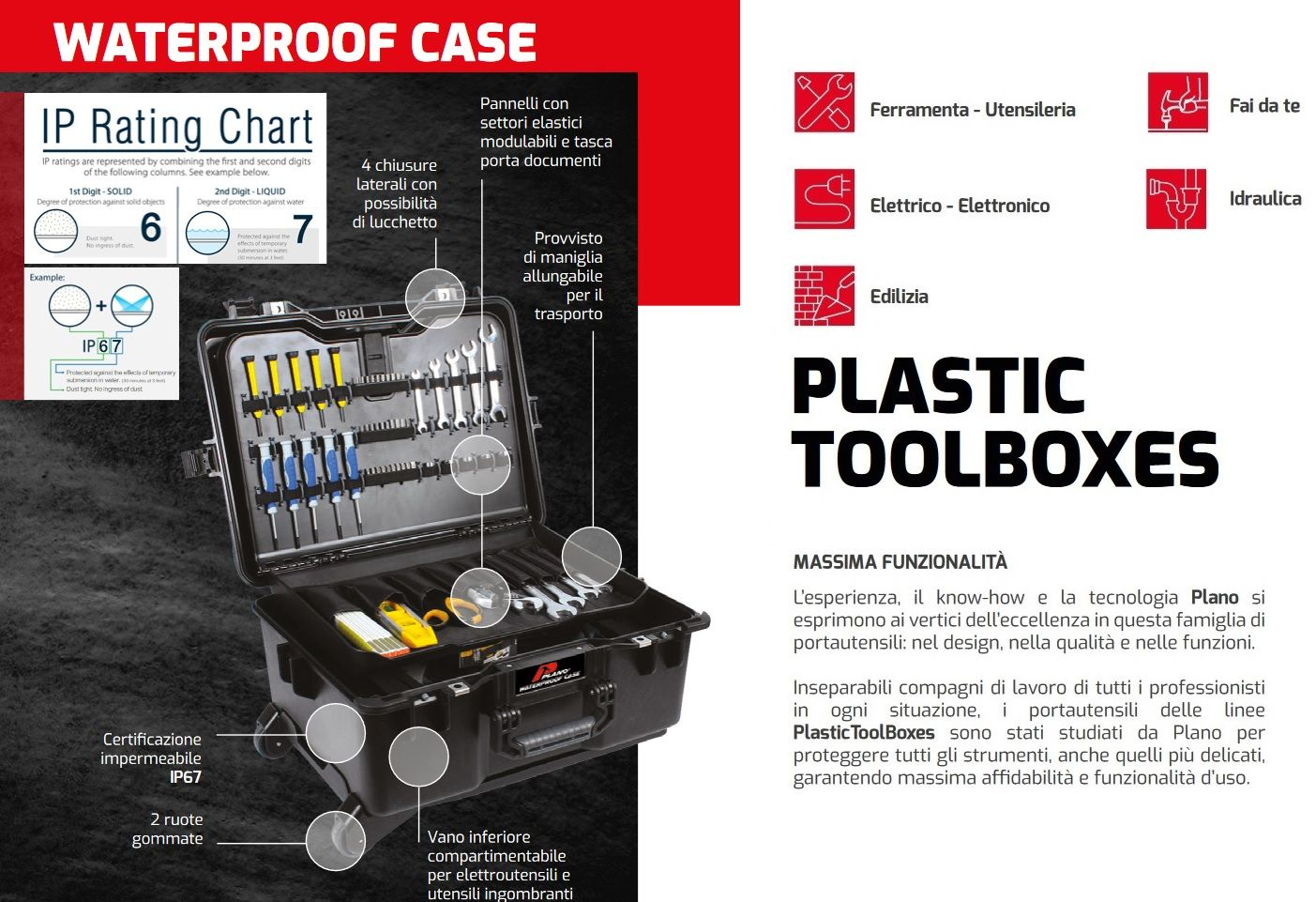 I portautensili della linea Plano "Waterproof case" sono stati studiati per proteggere tutti gli strumenti,attrezzi, utensili e elettroutensili da lavoro anche quelli più delicati, dalla corrosione dell'acqua e dagli impatti garantendo massima affidabilità e funzionalità d'uso.