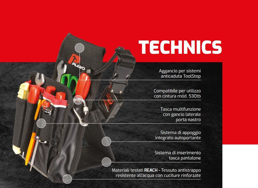 Pratica Tasca porta martello da cintura Plano "Technics" 538TB in tessuto speciale rinforzato, dotata di sistema di inserimento rapido dell'utensile, gancio in metallo oscillante adatto ad ogni tipo di martello.