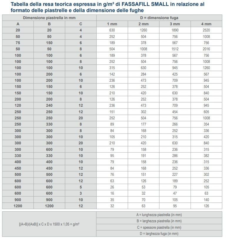 Aggiungere il 24-26% di acqua pulita a seconda della consistenza desiderata in base all'applicazione da effettuare (pavimenti o rivestimenti). Mescolare a mano o con agitatore meccanico a basso numero di giri per evitare di inglobare aria fino ad ottenere un impasto omogeneo e privo di grumi. L'impasto così ottenuto è lavorabile per circa 2 ore. Attendere 5 minuti, rimescolare e riempire completamente le fughe utilizzando una spatola gommata o racla. Intervenire in senso diagonale rispetto alle piastrelle, asportando l'eccesso di materiale con la spatola, sempre muovendo la stessa in senso diagonale rispetto alle fughe. Dopo che FASSAFILL SMALL risulta addensato e opaco in superficie (caratteristica che è raggiunta in tempi variabili a seconda delle condizioni di porosità del sottofondo, dello spessore e della natura della piastrella e delle condizioni ambientali), pulire con una spugna leggermente umida, sempre muovendo la stessa in senso diagonale rispetto alle fughe, avendo l'accortezza di usare due contenitori di acqua, uno per pulire la spugna e l'altro per completare la pulizia con acqua pulita. Mantenere uniforme il grado di bagnatura della spugna al fine di evitare disomogeneità di colore superficiale. La pulizia effettuata precocemente può causare un eccessivo svuotamento della fuga e difformità cromatiche sulla stessa. La pulizia finale delle fughe può eventualmente essere completata con uno straccio pulito e asciutto.