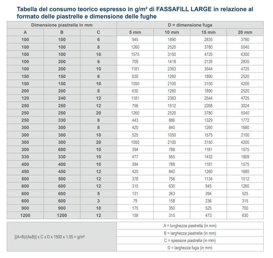 Aggiungere il 18-22% di acqua pulita a seconda della consistenza desiderata in base all'applicazione da effettuare (pavimenti o rivestimenti). Mescolare a mano o con agitatore meccanico a basso numero di giri per evitare di inglobare aria fino ad ottenere un impasto omogeneo e privo di grumi. L'impasto così ottenuto è lavorabile per circa 2 ore. Attendere 5 minuti, rimescolare e riempire completamente le fughe utilizzando una spatola gommata o racla. Intervenire in senso diagonale rispetto alle piastrelle, asportando l'eccesso di materiale con la spatola, sempre muovendo la stessa in senso diagonale rispetto alle fughe. Dopo che FASSAFILL LARGE risulta addensato e opaco in superficie (caratteristica che è raggiunta in tempi variabili a seconda delle condizioni di porosità del sottofondo, dello spessore e della natura della piastrella e delle condizioni ambientali), pulire con una spugna leggermente umida, sempre muovendo la stessa in senso diagonale rispetto alle fughe, avendo l'accortezza di usare due contenitori di acqua, uno per pulire la spugna e l'altro per completare la pulizia con acqua pulita. Mantenere uniforme il grado di bagnatura della spugna al fine di evitare disomogeneità di colore superficiale. La pulizia effettuata precocemente può causare un eccessivo svuotamento della fuga e difformità cromatiche sulla stessa. La pulizia finale delle fughe può eventualmente essere completata con uno straccio pulito e asciutto.
