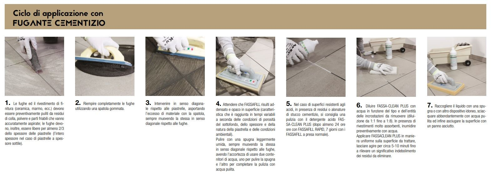 - Se dopo la finitura della fuga la superficie del rivestimento è sporca, utilizzare il pulitore acido FASSA-CLEAN PLUS, consultandone le relative scheda tecnica e di sicurezza, dopo almeno 7 giorni dal completamento delle operazioni di sigillatura delle fughe.