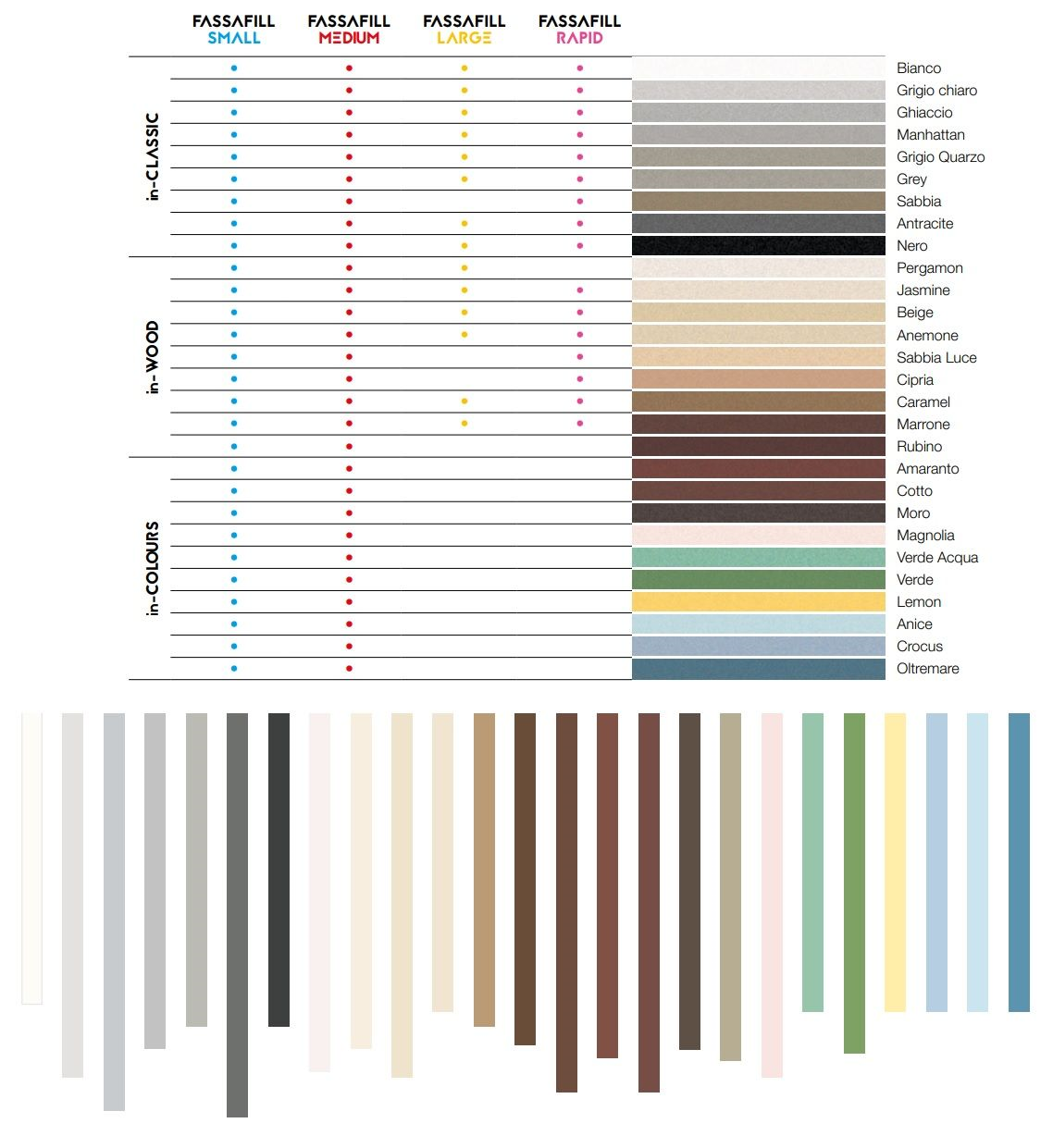 - Le tinte della cartella colori di FASSAFILL LARGE sono da considerarsi indicative, in quanto influenzate dalla porosità delle piastrelle del rivestimento.