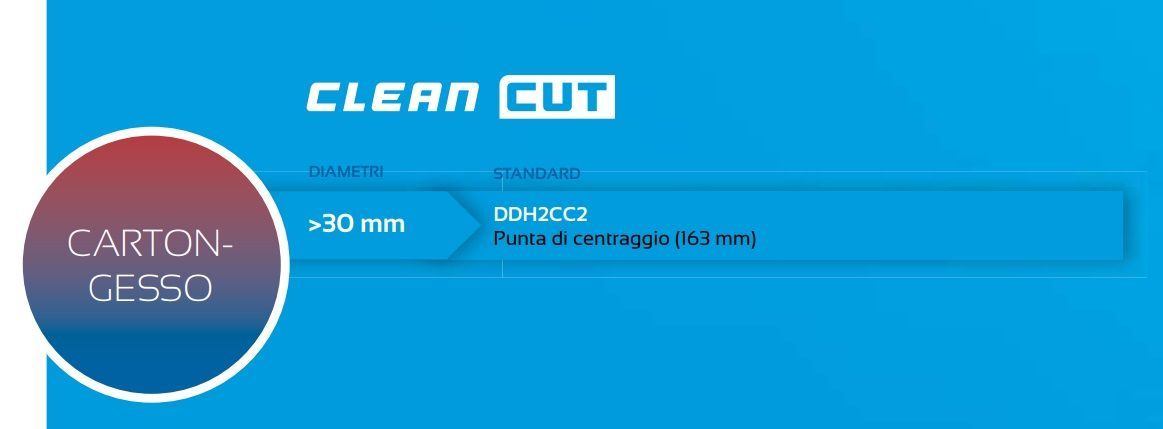 Sviluppato appositamente per l'uso del cartongesso. Una serie di seghe a tazza sofisticate con un diametro più preciso del 40% rispetto alle tradizionali. La speciale geometri della lama assicura tagli perfetti senza strappare la superficie di carta. Inoltre CleanCut è capace come nessun'altra di tagliare il materiale isolante come fibra di vetro e lana di roccia spesso posto dietro al pannello in cartongesso.