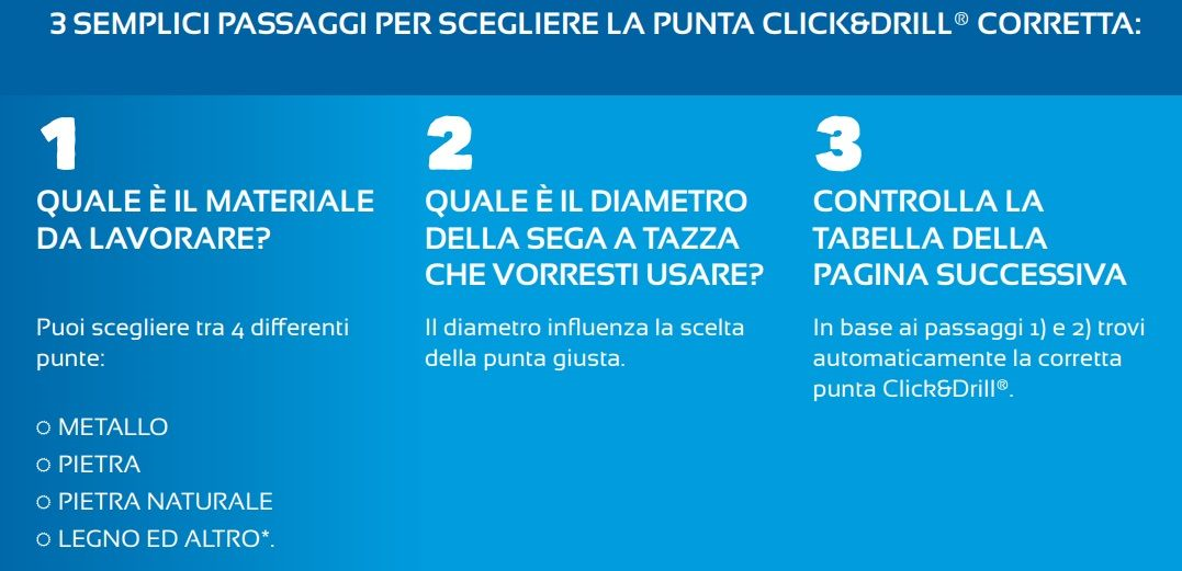 Il sistema brevettato Click & Drill®semplifica enormemente la sostituzione della sega a tazza e lo sgancio dell’attrezzo. L’allargamento dei fori esistenti non rappresenta assolutamente un problema grazie a questo sistema esclusivo. Il sistema Click & Drill® è integrato da diversi accessori. I nostri diversi accessori consentono di ottenere il massimo dalla sega a tazza.