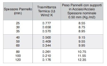 Il coefficiente di trasmissione termica (K) è stato calcolato considerando lo spessore reale dell'anima isolante senza il contribuito delle greche e tenendo conto delle resistenze superficiali.