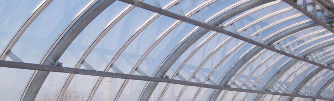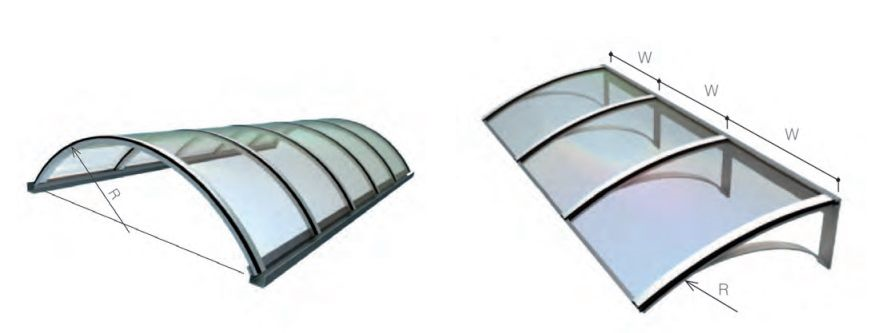 La lastra si presta ottimamente alla realizzazione di strutture integrali ad arco (tipo tunnel). Il raggio minimo di curvatura sarà pari a 150 volte lo spessore della lastra. La scelta dello spessore della lastra dipende , oltre che dal raggio di curvatura R , anche dalla larghezza della lastra W. La lunghezza L deve essere sempre maggiore della larghezza W .