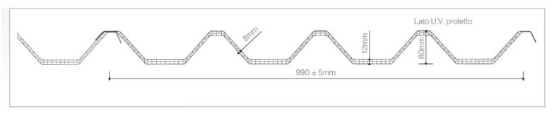 Spessore variabile da 8÷12 mm Altzza greca 80 mm Struttura 3 pareti Larghezza utile modulo 990 ± 5 mm Colori disponibili Cristallo/Opale