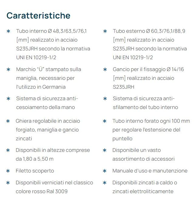 Resistenti, economici e versatili, i puntelli sono ideali per la costruzione di solai e per operazioni di puntellamento o ristrutturazione. I puntelli alta portata DIN EN 1065 vengono impiegati in tutto il mondo per operazioni di puntellamento e ristrutturazione. Per soddisfare ogni esigenza sono disponibili anche puntelli personalizzati per dealer e aziende di noleggio. Offriamo tre diverse classi di puntelli , che variano in base alla diversa capacità di carico : Classe A-B-C, le più leggere con portata varibile , Classe D con una portata garantita di 20 kN , e Classe E , la più robusta con i suoi 30 kN di portata. I puntelli DIN EN 1065 possono essere verniciati nel classico colore rosso Ral 3009 , zincati a caldo o elettoliticamente. In questo caso sono zincati a caldo.