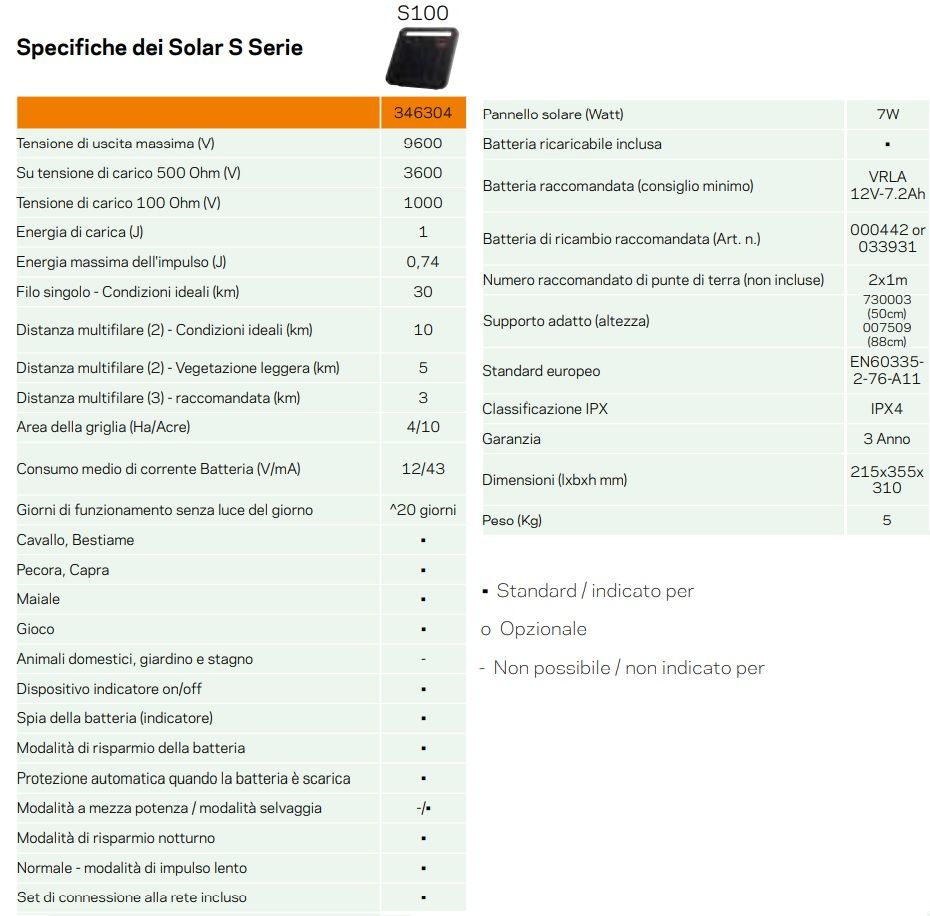 L’S100 è un potente elettrificatore con pannello solare integrato, in grado di elettrificare fino a 10km di recinzione. L’elettrificatore è alimentato ad energia solare, è completamente autonomo, molto robusto, leggero, facile da trasportare e installare. Anche senza sole è in grado di funzionare per 3 settimane. La robusta manopola consente di verificare lo stato di carica della batteria e accendere l’apparecchio. Sono disponibili due modalità: Animali selvatici: Massima frequenza degli impulsi sia di giorno che di notte. Animali domestici: Frequenza degli impulsi ridotta durante la notte. Soluzione perfetta per le recinzioni elettrificate nel settore dell'allevamento e della zootecnia, con un eccellente rapporto qualità-prezzo.