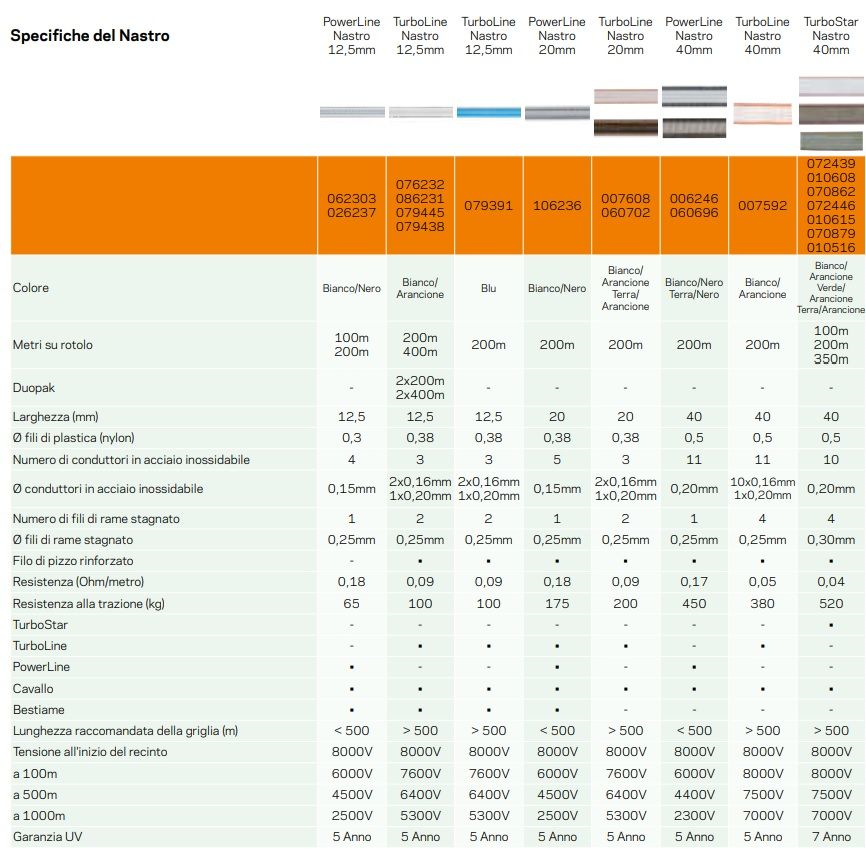 Colore: bianco Metri sul rotolo: 200 m Larghezza (mm): 12,5 ø fili di plastica (nylon): 0,38 mm Numero di conduttori in acciaio inossidabile: 3 ø conduttori in acciaio inossidabile: 2x0,16 mm / 1x0,20 mm Numero di fili di rame stagnato: 2 ø fili di rame stagnato: 0,25 mm Resistenza (Ohm/metro): 0,09 Reistenza alla trazione (kg): 100 Tensione all'inizio del recinto: 8000V Tensione a 100m: 7600V Tensione a 500m: 6400V Tensione a 1000m: 5300V Garanzia UV: 5 Anni