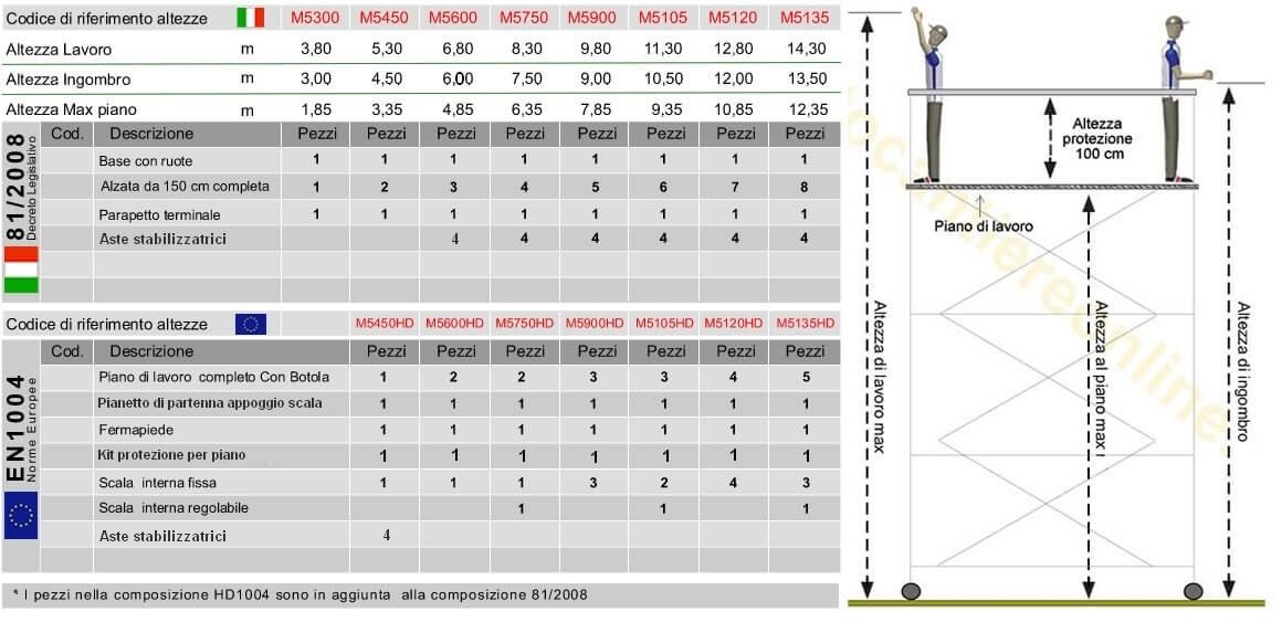 MODELLO M5135 HD : Altezza lavoro 14,30 m Altezza ingombro 13,50 m Altezza max piano 12,35 m Componenti: 1 Base con ruote 8 Alzate da 150 cm completa 1 Parapetto terminale 4 Aste stabilizzatrici 5 Piano di lavoro completo con botola 1 Pianetto di partenna appoggio scala 1 Fermapiede 1 Kit di protezione per piano 3 Scala interna fissa 1 Scala interna regolabile