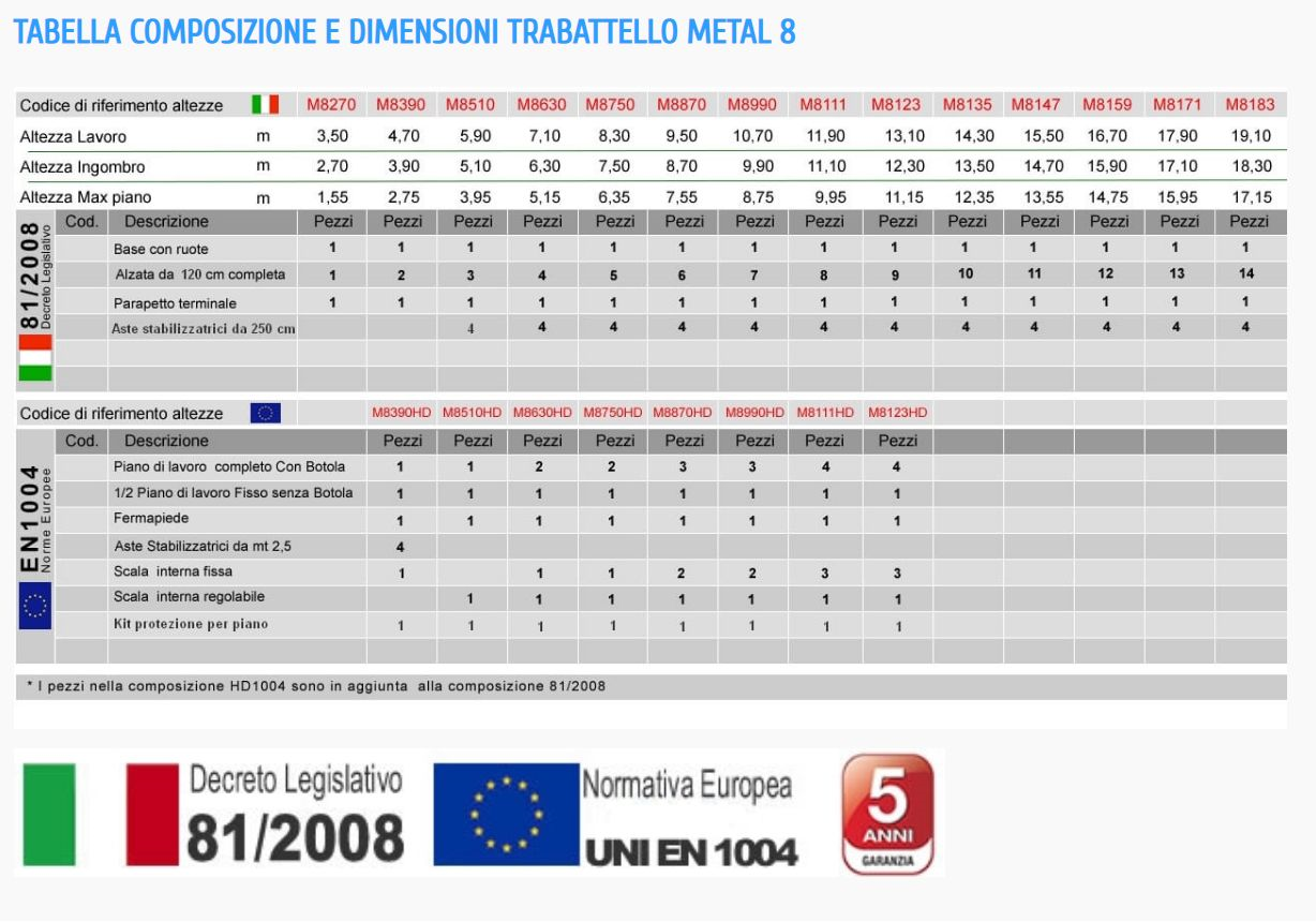 MODELLO M8390 HD: Altezza lavoro 4,70 m Altezza ingombro 3,90 m Altezza max piano 2,75 m Componenti: 1 Base con ruote 2 Alzate da 120 cm completa 1 Parapetto terminale 1 Piano di lavoro completo con botola 1/2 Piano di lavoro fisso senza botola 1 Fermapiede 4 Aste stabilizzatrici da 2,5 mt 1 Scala interna fissa 1 Kit di protezione per piano