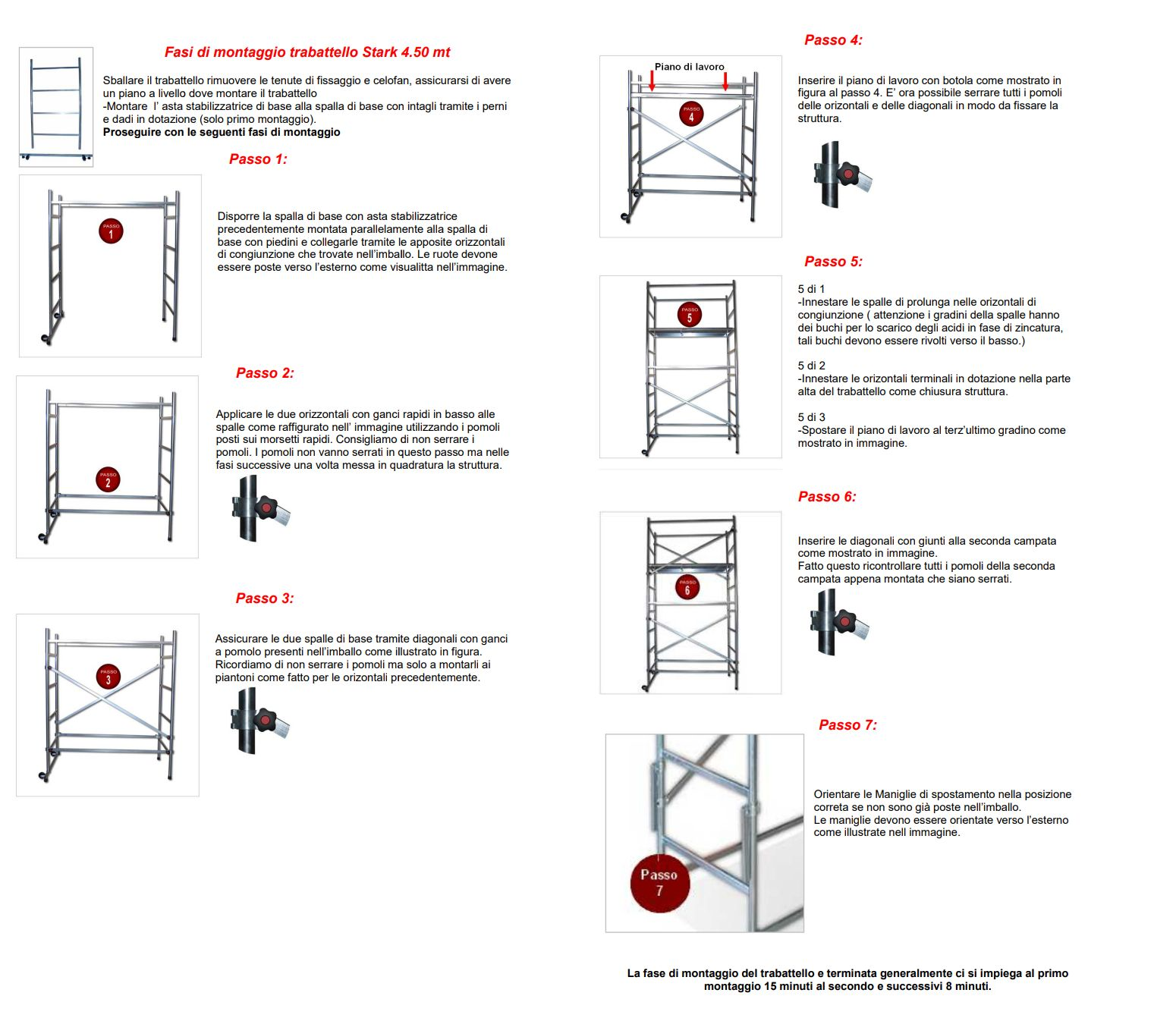 1 Asta stabilizzatrice di base 6 Spalle da 170 cm 2 Orizzontali di base con ganci rapidi 4 Orizzontali di congiunzione 2 Orizzontali di chiusura terminale 6 Diagonali con ganci rapidi 2 Piani di lavoro 150 x 62,5 con botola 2 Aste stabilizzatrici telescopiche