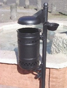 Cesto di aspetto e finitura particolarmente curato adatto all’inserimento in centri storici ed aree urbane. Il cesto è realizzato in lamiera zincata spessore 10/10 e il palo in tubolare di acciaio zincato diametro 60 mm spessore 2 mm, sul quale è applicato un ricciolo ornamentale in fusione che funge da sostegno e fulcro di ribaltamento del cesto. Completo di coperchio, sistema aggancio/sgancio con apposita chiave e posacenere applicato al palo (vedi immagine). Tutti i particolari sono verniciati in colore grigio antracite con trattamento a polveri ferromicacea ad alta resistenza.
