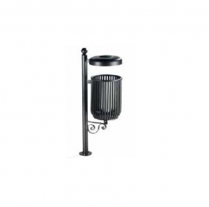 Fissato nella parte bassa ad un sostegno ornato di ricciolo che permette la rotazione a 180° per lo svuotamento del cestino e con vite nella parte alta del palo.