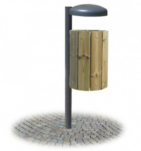 Cestino circolare con realizzato mediante lamiera d’acciaio zincato sp. 10/10 delle dimensioni Ø mm. 280x440h rivestito con doghe di pino impregnato in autoclave mediante sali atossici che lo proteggono da funghi, batteri e dal fenomeno della marcescenza. Palo di sostegno realizzato mediante tubo tondo d’acciaio zincato dotato all’apice copritesta alettato in PE e tettuccio in lamiera stampata zincata sp. 30/10. Sistema di svuotamento mediante sgancio con chiave a brugola fornita in dotazione. Il palo e tettuccio subiscono un processo di pre-trattamento di sgrassaggio delle impurità attraverso soluzioni a vapori, successivamente asciugate e sottoposte a operazioni di verniciatura mediante pistole elettrostatiche che ricoprono i pezzi di vernice di polvere allo stato farinoso.