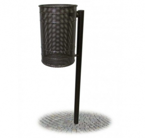 Cestino realizzato interamente in lamiera sagomata e forata d’acciaio zincato. Dimensioni del cestello Ø cm 28 x 44 h. Palo di sostegno realizzato mediante tubo tondo d’acciaio Ø mm. 50 x 2 con all’apice copritesta alettato in PE. Sistema di svuotamento mediante sgancio con chiave a brugola fornita in dotazione. Le parti in acciaio zincato subiscono dapprima processo di pre-trattamento di sgrassaggio delle impurità attraverso soluzioni a vapori, successivamente asciugate e sottoposte a operazioni di verniciatura mediante pistole elettrostatiche che ricoprono i pezzi di vernice di polvere allo stato farinoso. Successivamente il manufatto è sottoposto a polimerizzazione in forno, ovvero, processo che permette alla polvere di solidificarsi cocendo ad una temperatura di 180/200° C in un forno a circolazione di aria calda. I pezzi usciti dal forno vengono raffreddati naturalmente. Le polveri utilizzate nel processo di verniciatura sono atossiche secondo normative vigenti. Colorazione RAL a discrezione del cliente. Ferramenta e bulloneria: zincata a norma UNI 3740