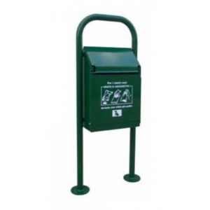 Il cesto raccolta, di cm 34x50x25, è costruito in lamiera e dispone di un coperchio girevole che consente il facile inserimento dei rifiuti e di una porta anteriore che, aperta, facilita l’estrazione del contenitore interno per lo svuotamento dei rifiuti. L’elemento di sostegno ad arco è realizzato in tubolare di acciaio h. totale 109, 5 cm. La struttura è predisposta per il fissaggio a terra con tasselli (esclusi). Tutte le parti metalliche sono zincate a caldo e verniciate a forno.