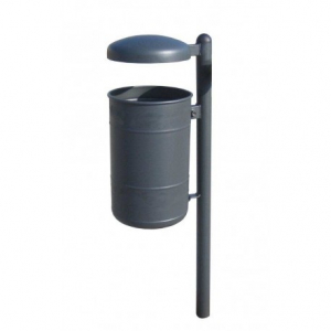 Cestello realizzato interamente in lamiera sagomata d’acciaio zincato sp. 10/10 con disegni disposti su due file. Fondo realizzato mediante disco in lamiera stampata sp. 15/10 dotato di fori per lo scolo delle acque piovane. Dimensioni del cestello Ø cm 30 x 45 h. Palo di sostegno realizzato mediante tubo tondo d’acciaio zincato Ø mm. 60 x 2 con all’apice copritesta alettato in PE completo di tettuccio bombato in lamiera d’acciaio zincato sp. 30/10. Sistema di svuotamento mediante sgancio con chiave a brugola fornita in dotazione. Le parti in acciaio zincato subiscono dapprima processo di pre-trattamento di sgrassaggio delle impurità attraverso soluzioni a vapori, successivamente asciugate e sottoposte a operazioni di verniciatura mediante pistole elettrostatiche che ricoprono i pezzi di vernice di polvere allo stato farinoso. Successivamente il manufatto è sottoposto a polimerizzazione in forno, ovvero, processo che permette alla polvere di solidificarsi cocendo ad una temperatura di 180/200° C in un forno a circolazione di aria calda. I pezzi usciti dal forno vengono raffreddati naturalmente. Le polveri utilizzate nel processo di verniciatura sono atossiche secondo normative vigenti. Colorazione RAL a discrezione del cliente. Ferramenta e bulloneria: zincata a norma UNI 3740 Ancoraggio: da interrare