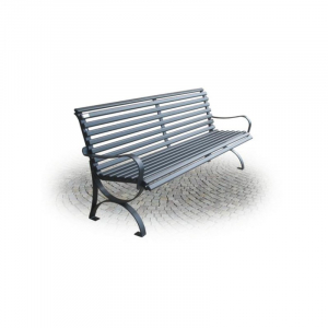 Panchina composta da 2 supporti con bracciolo realizzati in ferro piatto zincato mm. 50x8; seduta anatomica realizzata mediante doghe in tubolare ovale d’acciaio zincato sezione mm. 40 x 20 lunghezza cm 200 dotate di copri testa alettato in P.E.