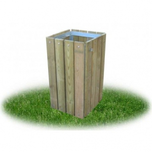 Telaio realizzato mediante profili d’acciaio pieno zincato rivestito con doghe in pino impregnato in autoclave mediante sali atossici sez. mm. 90 x 20 x 810. Sistema di apertura frontale con chiave fornita in dotazione per una facile asportazione dei rifiuti.