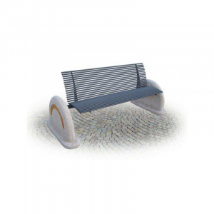 Panchina composta da supporti in calcestruzzo bianco tipo travertino trattato antidegrado e rompitratta in tubo tondo d'acciaio zincato diametro mm. 60. Sostegni per seduta e schienale realizzati in lamiera sagomata con tecnologia laser sp. 60/10. Seduta e schienale della lunghezza di cm 150 realizzate mediante profili in tubo tondo d'acciaio zincato Ø mm. 20 dotati di copritesta alettati in PE.