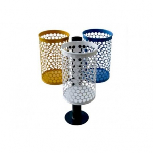 Struttura: Cestelli in lamiera d’acciaio zincato sp. 10/10 dimensioni Ø cm 28 x 42 h con fori sagomati con tecnologia laser, fondello in lamiera sp. 10/10 forato per lo scolo delle acque piovane. Palo di sostegno realizzato in tubo tondo d’acciaio zincato Ø mm. 76 dotato di piastra tonda in lamiera d’acciaio zincato per l’ancoraggio filo pavimento. Disponibile in varie composizioni ed optional (con tettuccio, posacenere…)