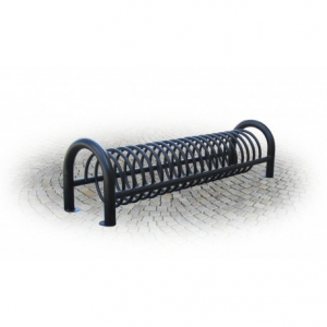 Portabiciclette composto da 2 sostegni ad “U” dell’altezza di cm. 42 realizzati in tubo tondo d’acciaio zincato Ø mm 60 completi di piastra per l’ancoraggio al terreno. I sostegni sono uniti da due tubi tondi d’acciaio zincato Ø mm. 40 che supportano la spirale realizzata in tubo tondo d’acciaio zincato Ø mm. 20. Le parti in acciaio zincato sono verniciate a polveri in colori RALa scelta della D.L.