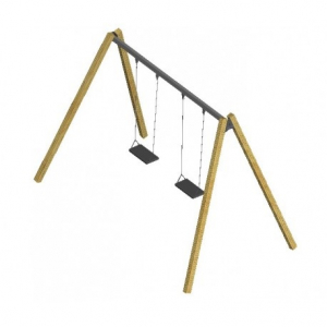 Altalena a due posti, struttura costituita da una trave di sostegno in ferro rettangolare da 8 x 5 L=290 cm zincata a caldo alla quale vengono fissati i giunti di sostegno del sedile; 4 montanti in lamellare di pino nordico impregnato a sali in autoclave come da norme DIN 68800 e RAL, di sez. 90x90 mm con bordi raggiati minimo raggio 3 e speciale doppia fresatura su ciascun lato atta a convogliare le naturali fessurazioni del legno eliminando qualunque rischio di scheggiatura, 2 sedili a tavoletta tipo C/13, con anima in acciaio e catene zincate a caldo, a norma DIN 766/A diam. 6 mm a maglia corta che impedisce l’intrappolamento delle dita del bambino. Questo sedile è molto sicuro dato l’alto assorbimento dell’impatto, zigrinatura anti-scivolo e assenza di protuberanze, bordi di contorno soffici ed a prova di scheggia; internamente è rinforzato da una struttura di acciaio tenero.
