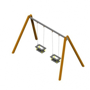 La struttura è costituita da una trave di sostegno in ferro rettangolare da 8 x 5 L=290 cm zincata a caldo e verniciata alla quale vengono fissati i giunti di sostegno del sedile; 4 montanti in lamellare di pino nordico impregnato a sali in autoclave come da norme DIN 68800 e RAL, di sez. 90x90 mm con bordi raggiati minimo raggio 3 e speciale doppia fresatura su ciascun lato atta a convogliare le naturali fessurazioni del legno eliminando qualunque rischio di scheggiatura, 2 sedili a cestello B/14 con anima in acciaio e catene zincate a caldo, a norma DIN 766/A diam. 6 mm a maglia corta che impedisce l’intrappolamento delle dita del bambino.