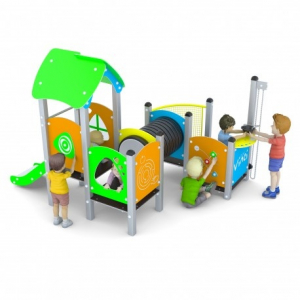 Gioco a torrette con scivolo adatto alla prima infanzia, con pannelli interattivi che rendono il gioco fruibile anche da parte di bambini con disabilità motorie, per la progettazione e realizzazione di un parco giochi inclusivo. Montanti in tubolare di acciaio inox sezione 80x80 mm elementi di tamponamento in polietilene alta densità sagomato al pantografo. Piani di calpestio in polietilene alta densità