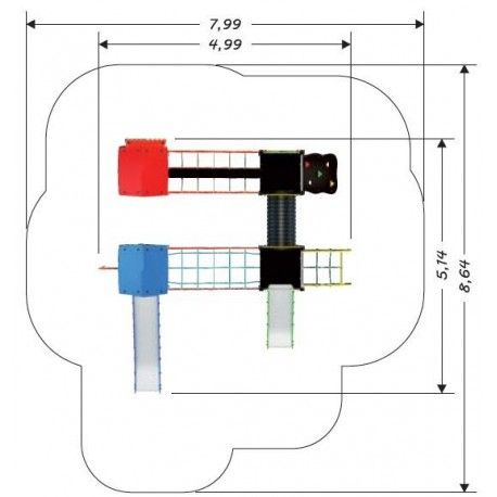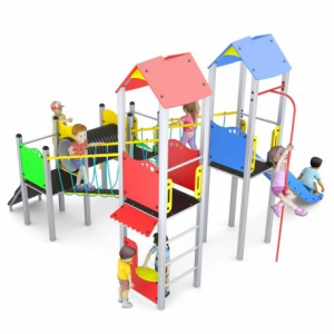 Castello completo di scivoli con pista in acciaio inox e fianchi in polietilene alta densità PEHD, montanti in tubolare d’acciaio 80x80 mm zincato e verniciato polveri ; tamponamenti, tetti e pannelli in polietilene alta densità PEHD, ponte tibetano con funi Hercules, arrampicate con piani in polietilene e prese d’arrampicata in resina, ponte tunnel a doppia parete in polipropilene.