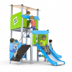 Castello con struttura in tubolare di acciaio INOX 80x80 mm scivolo con pista in acciaio inossidabile tamponamenti, tetti, pannelli, piani di calpestio e rampe in laminato HP.
