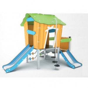 Castello costituito da: Piani di calpestio in laminato HPL altezza piano: 90 cm (n°1) – 60 cm (n°1) 1 tetto a 2 falde in laminato HPL 2 scivoli con pista in acciaio inox 1 rampa di risalita in laminato HPL 1 gioco “pallottoliere” 1 pertica con gradini