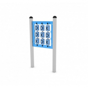 Pannello per attività sensoriale e di relazione, accessibile a tutte le fasce d’età ed anche a bambini con disabilità motorie. Realizzato con 2 montanti in acciaio sezione 80 x 80 mm zincati e verniciati 3 barre in acciaio inox alle quali sono ancorati, per mezzo di barre filettate, 9 cilindri in polietilene a stampaggio rotazionale con simboli X e 0 serigrafati