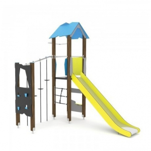 1 tetto a 2 falde in PEHD 1 pannello di tamponamento in PEHD 1 pannello di tamponamento con davanzale in PEHD 1 coppia pannelli protezione scivolo 1 coppia pannelli protezione pertica 1 pertica in acciaio 1 scivolo con pista in acciaio inox e sponde in PEHD H=150 CM 1 piano di calpestio realizzato in multistrato marino con film fenolico antiscivolo 1 pannello verticale con prese e fori per arrampicata in PEHD 1 percorso sospeso su funi a 3 passaggi 1 rete con funi tipo hercules con anima in acciaio e rivestimento in poliammide