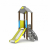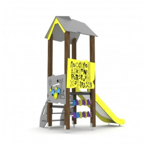 Composto da: 1 tetto a due falde in polietilene ad alta densità. 4 montanti in lamellare di pino nordico sez. 90x90 mm con staffa in acciaio zincato per l'ancoraggio al terreno. 2 pannelli ludico motori 1 scala con gradini ad h=90 cm, corrimano in polietilene ad alta densità. 1 scivolo con pista in acciaio inox fianchi in polietilene ad alta densità. 1 pallottoliere con pannellini verticali in PEHD e tubolare in acciaio inossidabile.