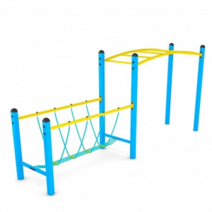 Esercizio di coordinamento ed abilità: appendersi, e passare da una parte all’altra della scala per poi attraversare il ponte in corda esercita un senso di equilibrio. L'attrezzo è costituito da 6 montanti in acciaio profilo 80x80 mm, zincato e verniciato a polvere; viti e dadi nascosti da cappucci colorati in plastica.