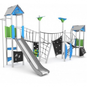 Castello quattro torri con due scivoli pista in acciaio inox e fianchi in polietilene.
