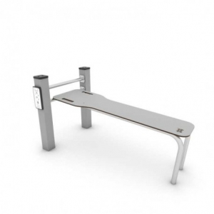 Composizione per esercizi ginnici all’aperto con struttura portante in pali da cm 10x10 in acciaio zincato verniciato con tappi di chiusura in plastica, barre orizzontali e maniglie in acciaio inox; pannelli, sedili e piani in HPL, targhetta con istruzioni per gli esercizi. L’ancoraggio va effettuato su superficie piana a 80 cm di profondità. Attrezzi a norma EN 16630:2015