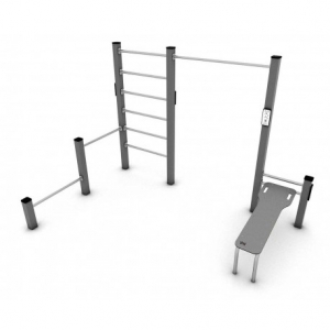 Composizione per esercizi ginnici all’aperto con struttura portante in pali da cm 10x10 in acciaio zincato verniciato con tappi di chiusura in plastica, barre orizzontali e maniglie in acciaio inox; pannelli, sedili e piani in HPL, targhetta con istruzioni per gli esercizi. L’ancoraggio va effettuato su superficie piana a 80 cm di profondità. Attrezzi a norma EN 16630:2015