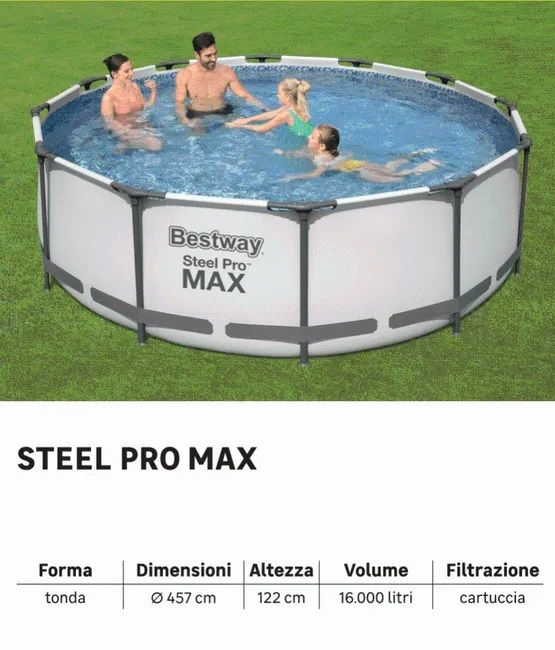 Struttura con telaio in metallo galvanizzato antiruggine Pareti in PVC-poliestere resistente, triplo strato Valvola di rapido svuotamento Dimensioni ø 457x107h cm Capacità (al 90%) 14.970 L Peso 61 kg