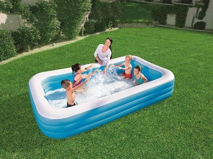 Piscina Fuoriterra Gonfiabile Rettangolare 183 x 305 x 56H cm Costruzione: gonfiabile Dimensioni piscinetta gonfiata: 305 x 183 x 56 cm Dimensioni non riempita: 300 x 178 cm Età consigliata: dai 6 anni Capacità acqua: 1.161 litri Struttura Robusta con 3 anelli d aria Fianchi extra larghi Valvole di sicurezza Valvola di scarico di fondo Realizzato in vinile resistente da 0,32 mm