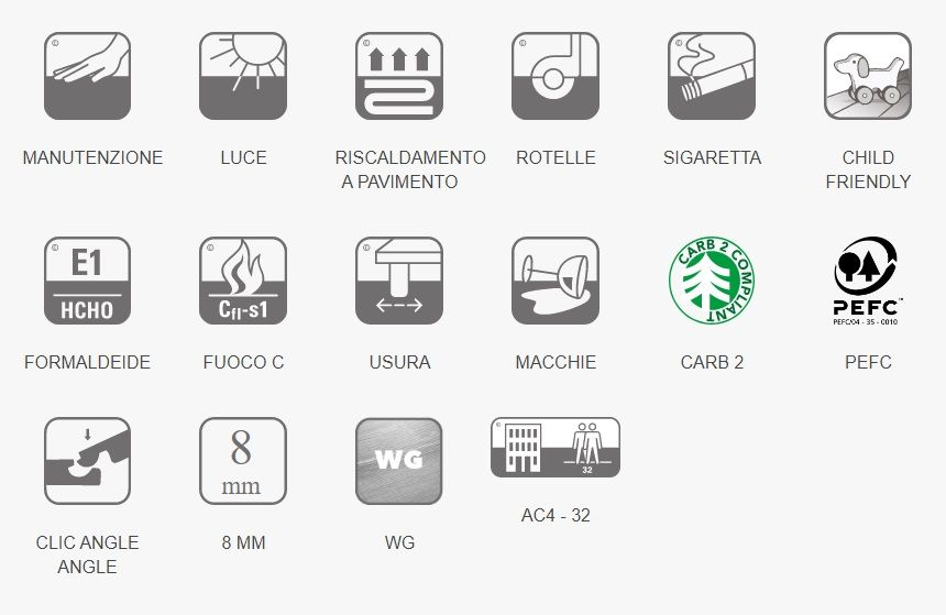 Caratteristiche tecniche: Superficie: Strato protettivo in corindone (ossido di alluminio) Decorativo : Carta melaminica o stampa diretta Supporto : HDF Strato Inferiore : Carta controbilanciante