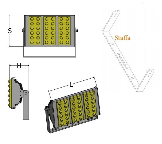 Montaggio: Il proiettore è dotato di un elegante ed efficiente sistema di montaggio a staffa che consente la regolazione in continuo del puntamento verticale su angolo di 360 °.