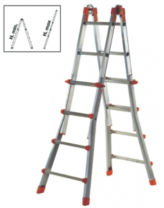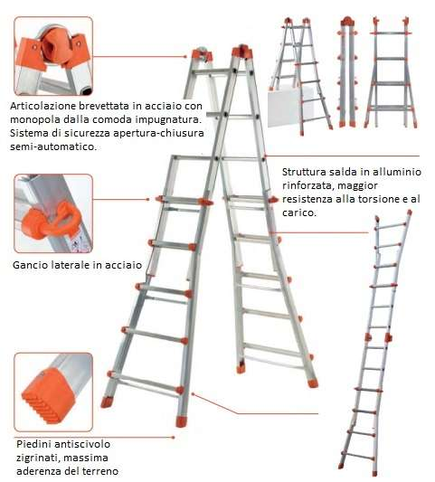 Certificata ACAL 100 conforme al D.LGS. 81/08 Montante tubolare mm. 51x22 Piolo esterno 25x25 mm Portata max 100 kg. Dimensioni Imballo: 141x63x21cm Altezza massima (da aperta): 481 cm