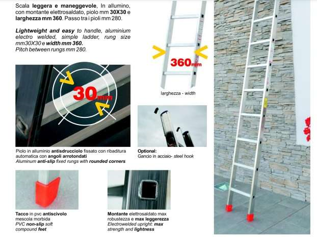 In alluminio, per esterni. Piedi antisdrucciolo. Sezione montanti mm 60x25 Gradini antisdrucciolo mm 25x25 8/10 gradini Altezza 250 cm / 300 cm Peso 5 kg