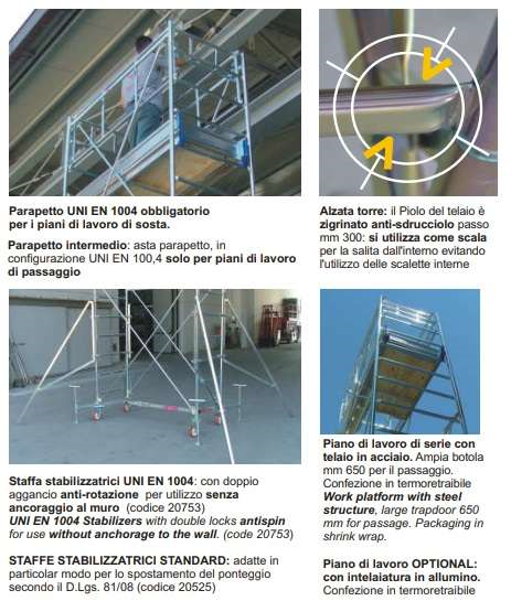 Luna è il ponteggio che con il tubo Ø mm 35, arriva fino a m 7,10 di altezza. È leggero e facilmente trasportabile con una dimensione base di m 1,75x0,75 è perfetto per lavorare in spazi ristretti. All'altezza di m 2,00 montato su base per interni si può schiacciare per il passaggio attraverso porte e lungo corridoi.