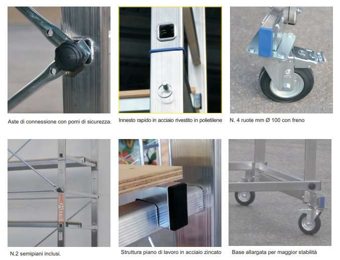 Modello ZEUS in alluminio, con 2 semipiani. 4 ruote con freno Altezza utile lavoro 198 cm Portata 150 kg Dimensioni cm 157x100x360h
